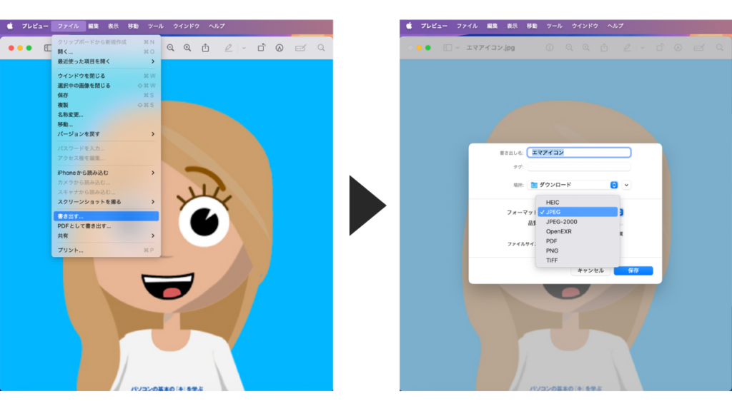 - 「ファイル」>「書き出す」から、フォーマットで希望の形式を選択して保存。