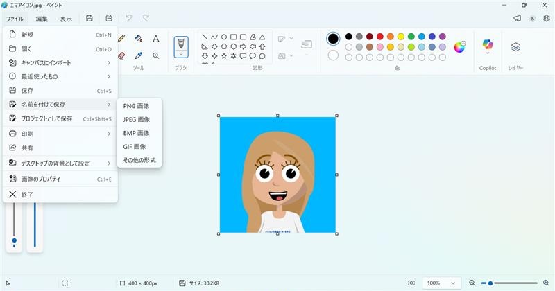 - 「ファイル」>「名前を付けて保存」から、jpg または png を選択して保存。