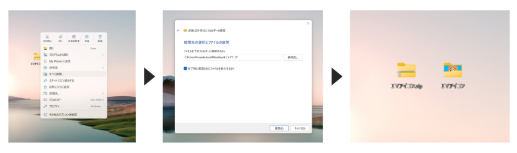 Windowsでは、ダブルクリックしただけだと「中身を覗いているだけ」の状態になり、正しく編集や保存ができません。以下の手順で完全に解凍してください。