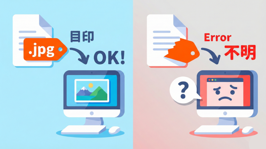 もし拡張子がなかったり間違っていたりすると、パソコンは「これは写真なのか?文書なのか?」が判断できず、ファイルを開くことができなくなってしまいます。