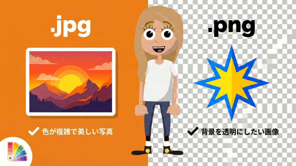 - PNG: 色数が少ない「ロゴ」「アイコン」や、「背景を透明にしたい画像」。