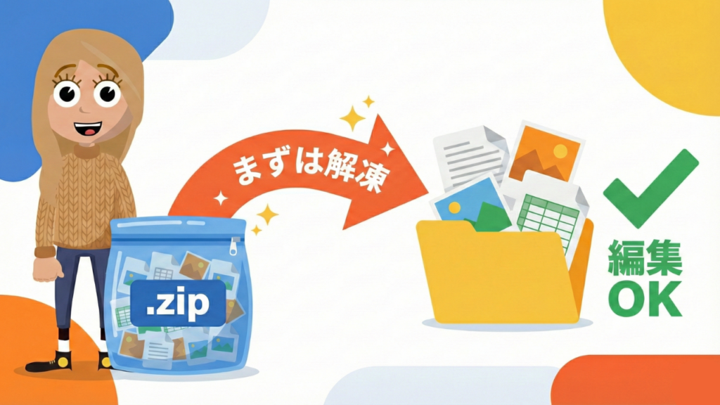 | ZIP(ジップ) | .zip | 複数のファイルを一つにまとめた「圧縮袋」のような形式です。 データを送りやすくしますが、必ず「解凍(展開)」してから使う必要があります。 |