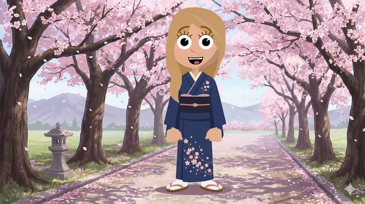 プロンプトこのキャラクターに、着物を着せた画像を作ってください。このキャラクターに紺色の着物を着せて、日本の桜並木を背景にした画像を作ってください。