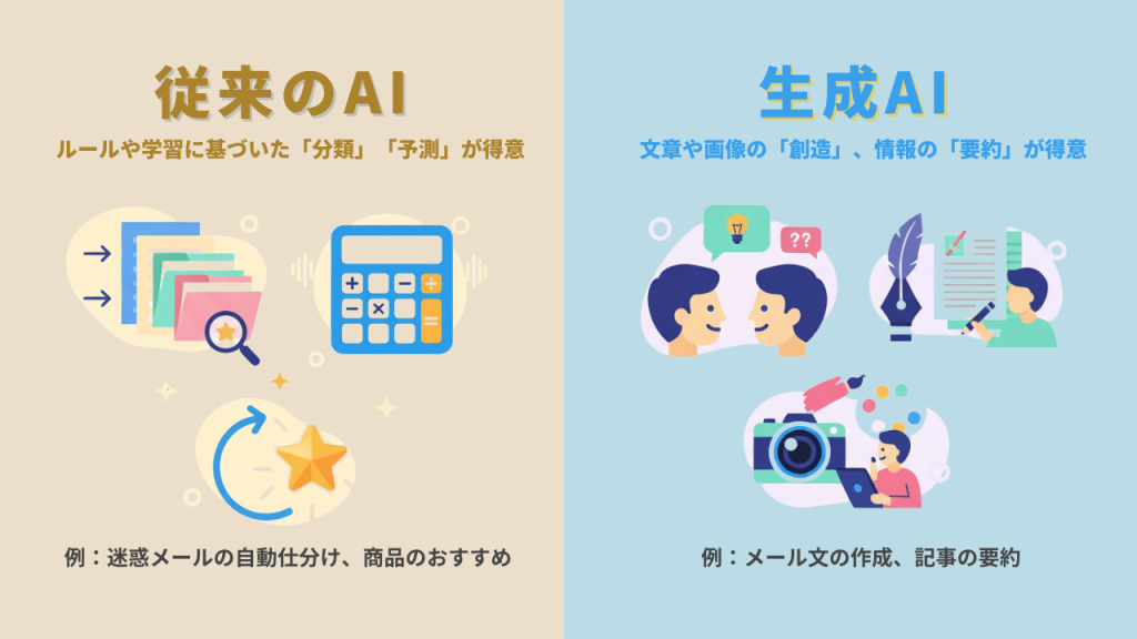 ChatGPTが世の中に広まったことにより、「AI」が身近なものになりましたが、これまでも私たちの生活の中にはAIが使われていました。それをここでは「従来のAI」といいましょう。この「従来のAI」と「生成AI」は、どちらも優れていますが、得意な分野が根本的に違います。