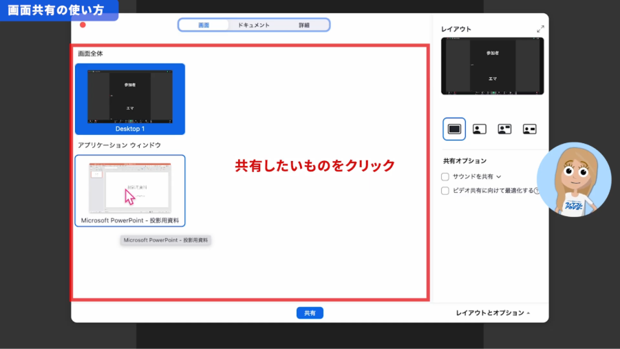 - 「画面の共有」をクリックし、共有したいウィンドウを選択します。
