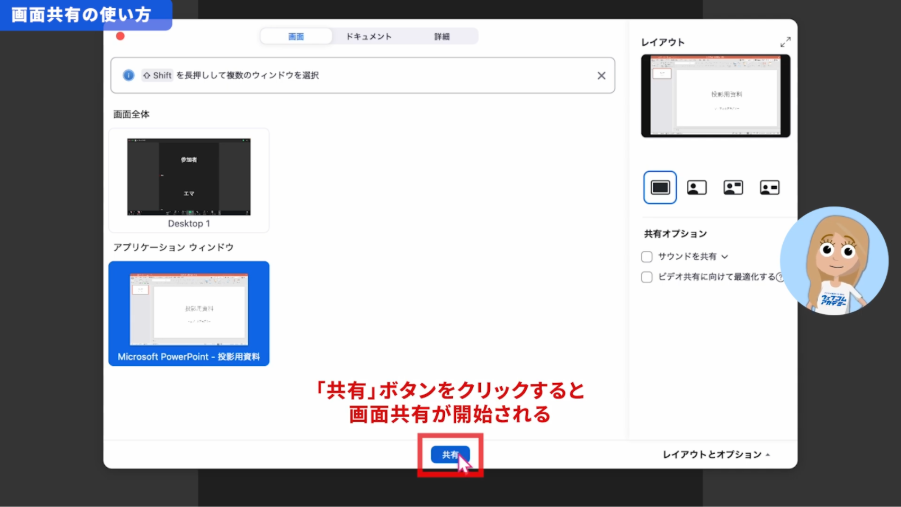 - 動画を見せる場合など、パソコンの音も聞かせたいときは「サウンドを共有」にチェックを入れます。