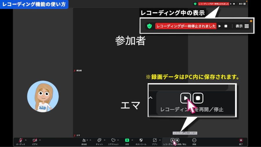 会議の内容を記録しておきたい場合は、「レコーディング」ボタンをクリックします。 ただし、参加者の顔や声が入るため、トラブル防止のために必ず事前に許可をとってから録画を開始しましょう。