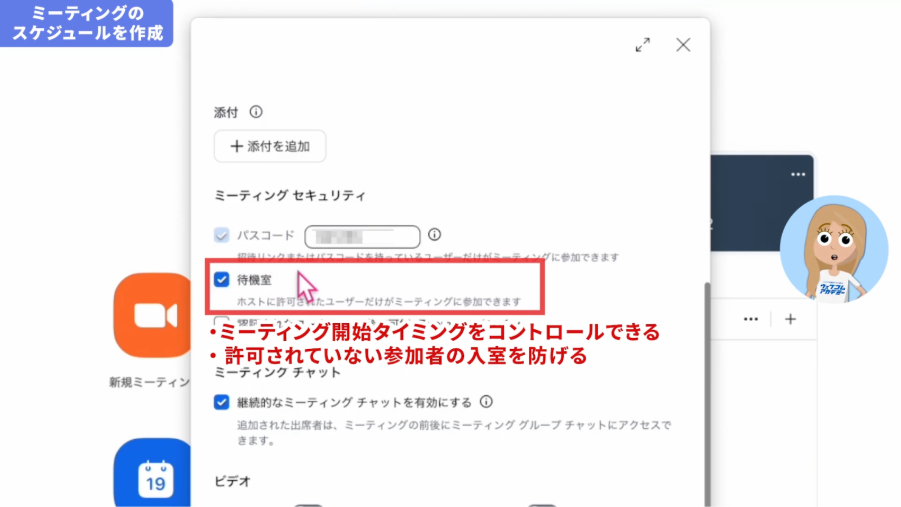 - スケジュール設定:日時、待機室、ビデオのオン/オフなどを事前に設定し、URLを共有する。