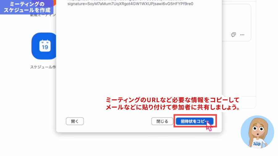 設定が終わったら「保存」をクリックします。 「招待状をコピー」をクリックすると、招待URLやミーティングID、パスワードがコピーされます。これをメールやチャットツールで参加者に送れば、招待は完了です。