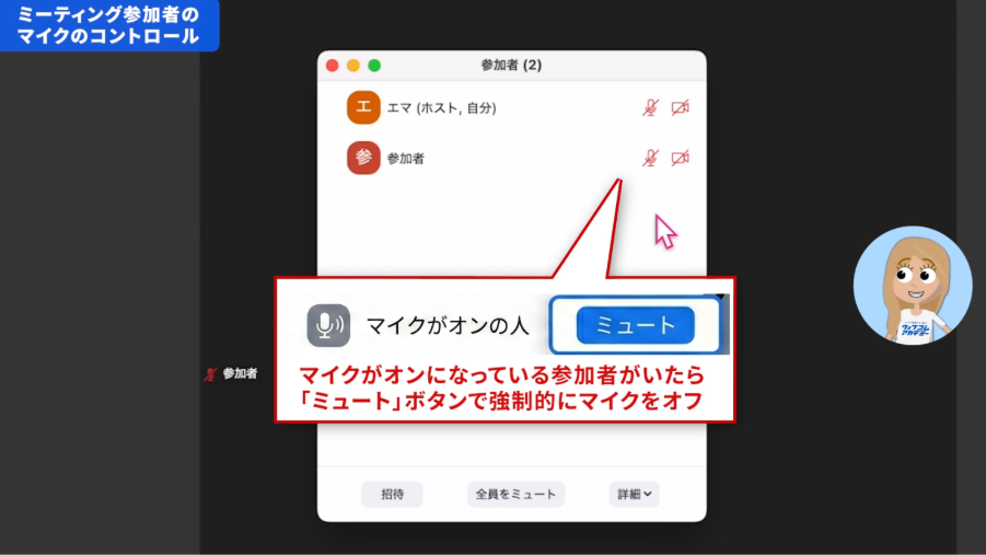 ここで、マイクやビデオの状態を確認できます。もし、参加者がマイクの切り忘れに気づかず雑音が入ってしまっている場合は、ホスト側で「ミュート」に設定してあげましょう。