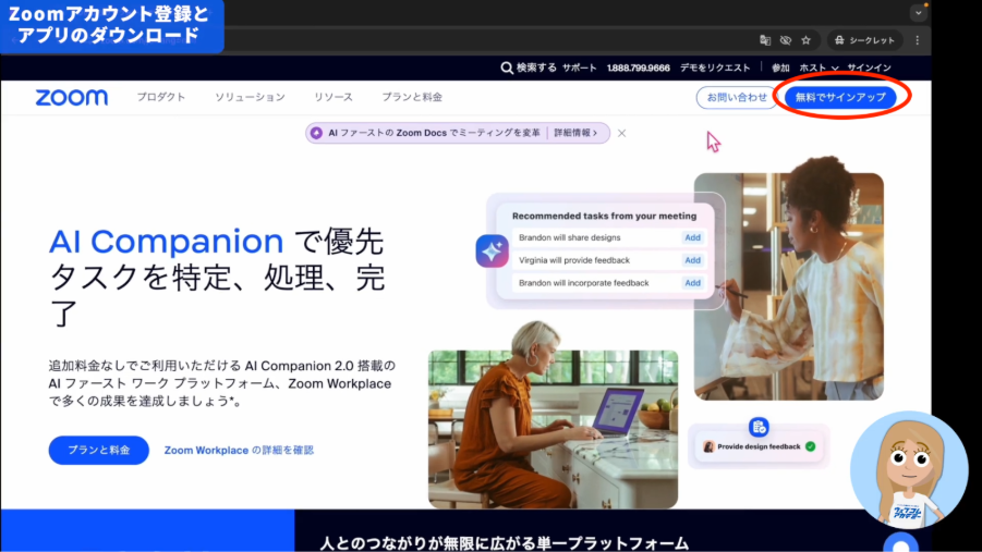 - Zoom公式ページの右上にある「無料でサインアップ」をクリックします。