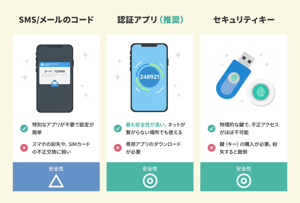 - 現時点で最も安全で推奨されるのは、認証アプリ(Google Authenticatorなど)を使う方法。
